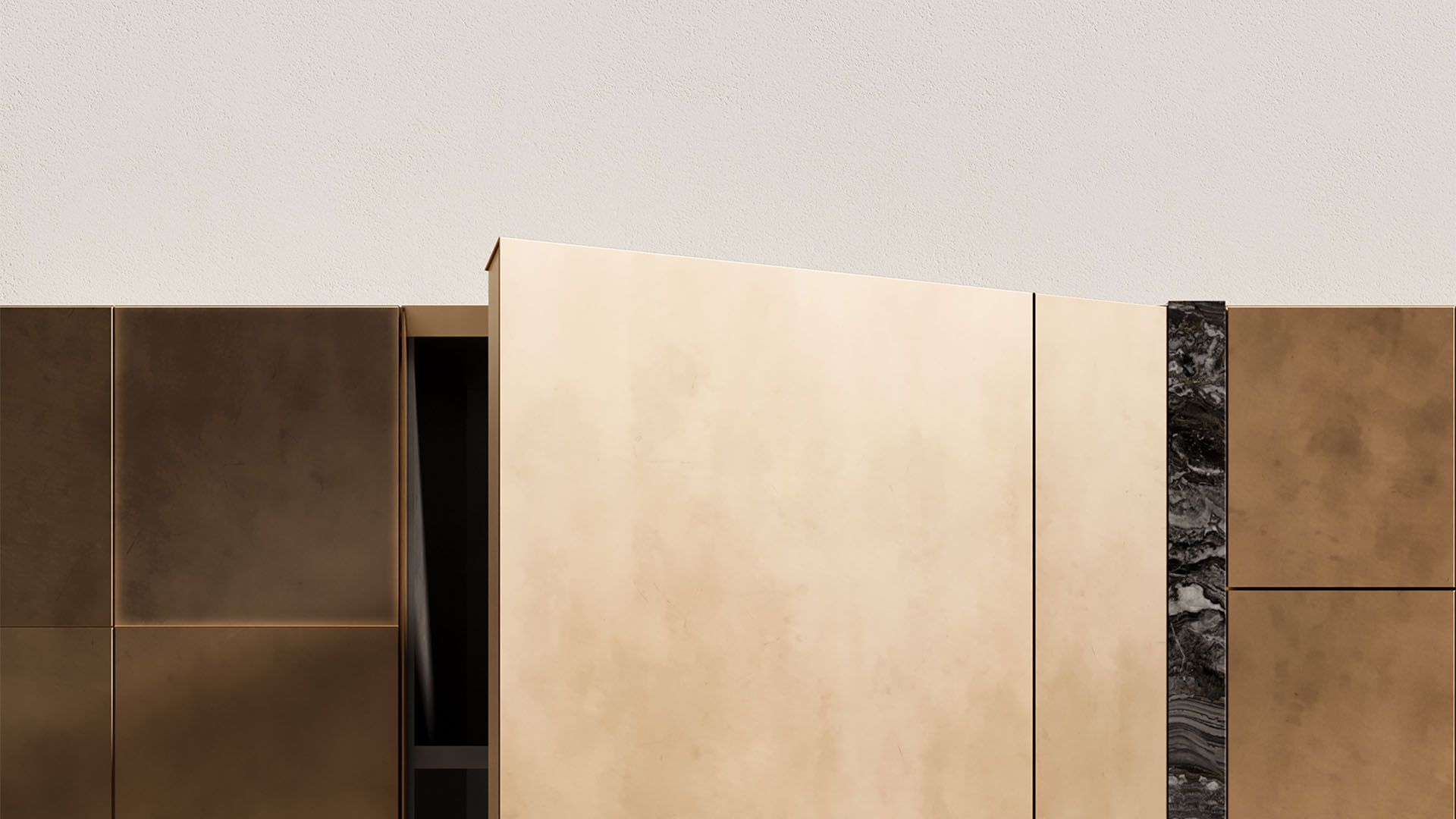 Codex fonde la potenza dei materiali con un design di grande impatto. La superficie frontale è un intarsio di pannelli che suggeriscono una lavorazione attenta del legno con diverse sfumature e finiture, crea una texture visiva ricca e invitante al tatto.
