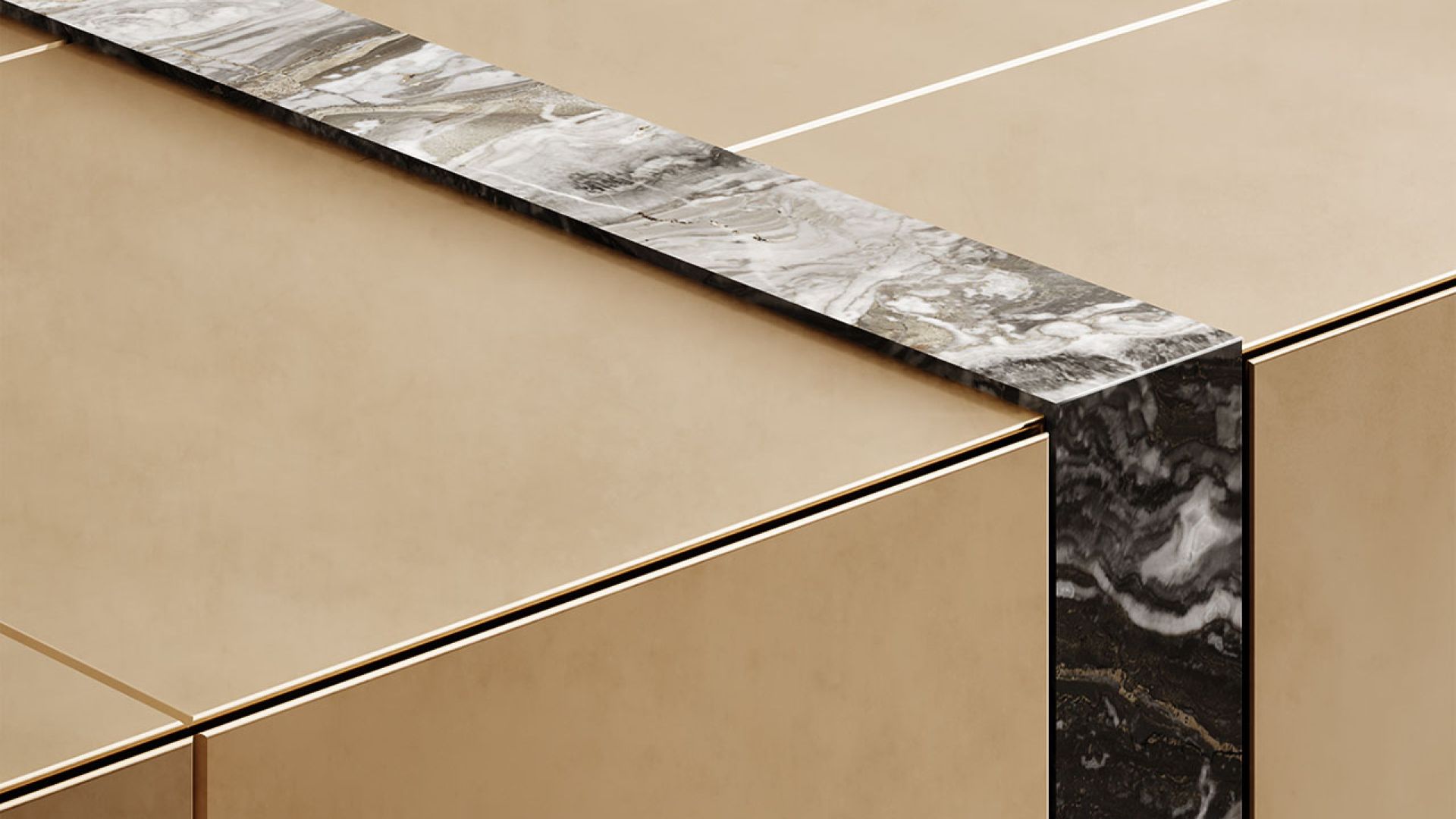 A interrompere questa continuità, e a sorreggere l’imponente struttura, si ergono due montanti in marmo grezzo, le cui venature naturali raccontano storie millenarie. Questa combinazione di superfici levigate e materie prime non trattate conferisce al mobile una presenza scenica straordinaria, un equilibrio tra raffinatezza e autenticità che definisce il nostro approccio al design.
